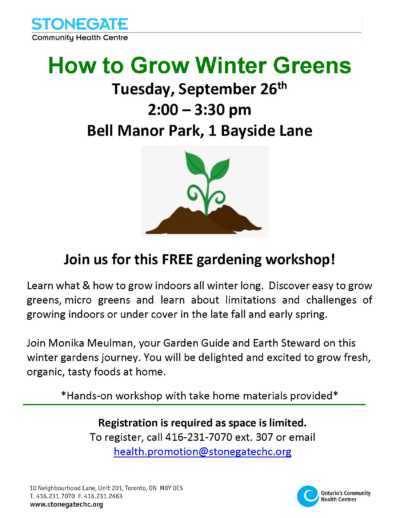 To register, call 416-231-7070 ext. 307 or email health.promotion@stonegatechc.org