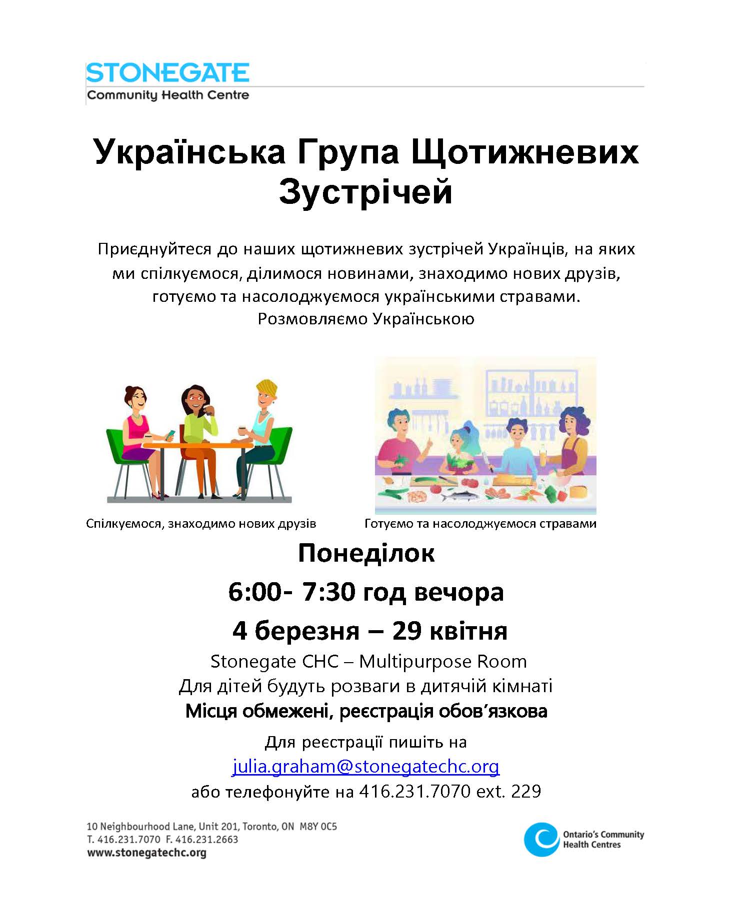 Щоб зареєструватися, надішліть електронною поштою Julia.graham@stonegatechc.org або зателефонуйте за номером 416 231 7070, ext. 229