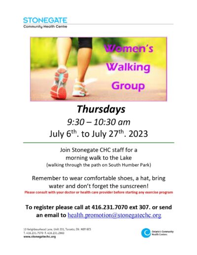 To register please call at 416.231.7070 ext 307. or send an email to health.promotion@stonegatechc.org