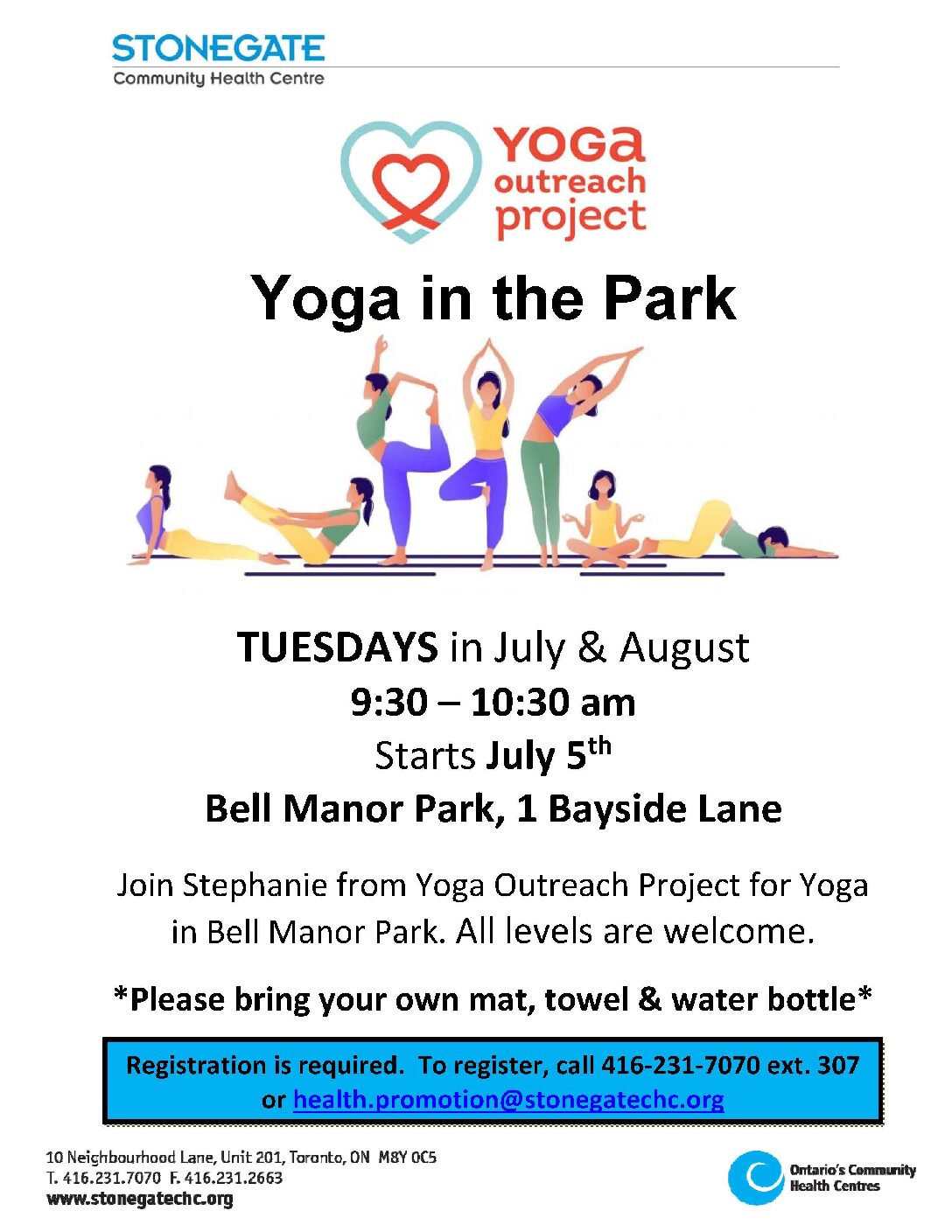 Registration is required. To register, call416-231-7070 ext. 307 or health.promotion@stonegatechc.org