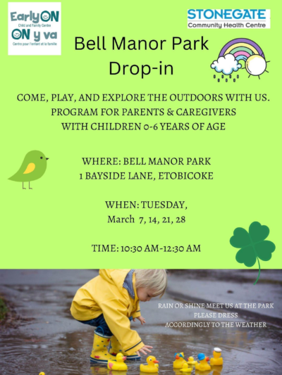 Bell Manor Park 1 Bayside lane, etobicoke, ONBell Manor Park Drop-in COME, PLAY, AND EXPLORE THE OUTDOORS WITH US. PROGRAM FOR PARENTS &CAREGIVERS WITH CHILDREN 0-6 YEARS OF AGE WHERE: BELL MANOR PARK 1 BAYSIDE LANE, ETOBICOKE WHEN: TUESDAY, March 7,14,21,28 TIME:10:30 AM-12:30 PM