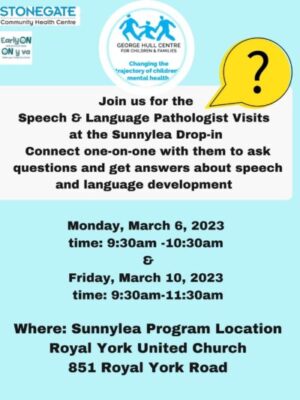 Royal York United Church 851 Royal York Rd, Etobicoke, ON, CanadaSpeech & Language Pathologist Visits Join us for the Speech & Language Pathologist Visits at the Sunnylea Drop-in Connect one-on-one with them to ask questions and get answers about speech and language development Monday, March 6, 2023 time: 9:30am -10:30am & Friday, March 10, 2023 time: 9:30am-11:30am Where: Sunnylea Program Location - Royal York […]