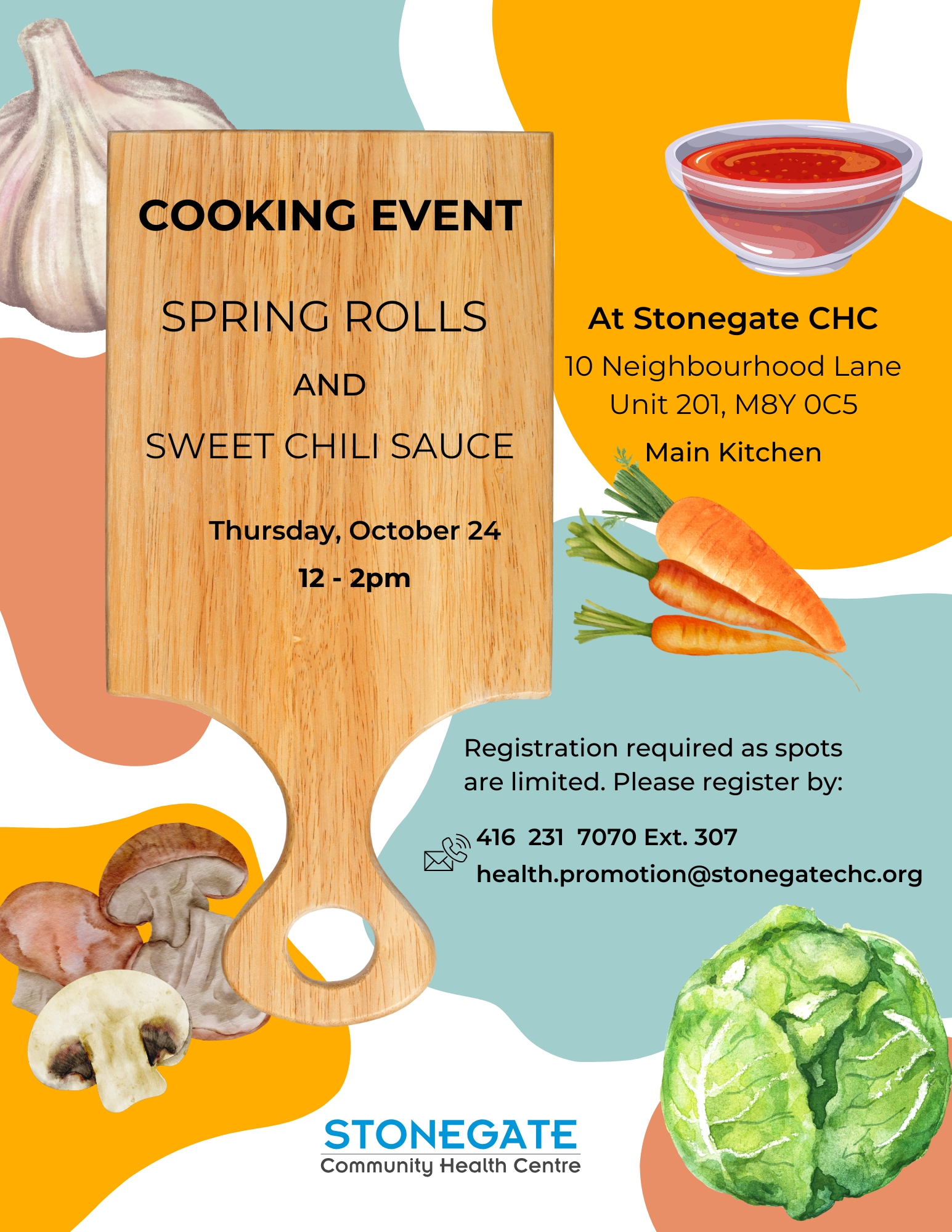 Spring Roll Cooking Workshop  SPRING ROLLS AND SWEET CHILI SAUCE Join us for a fun and delicious cooking workshop and learn how to make healthy and fresh Spring Rolls from scratch! 12 - 2pm, on Thursday, October 24 At Stonegate CHC - Main Kitchen Registration required as spots are limited. Please register by: Email: health.promotion@stonegatechc.org […]