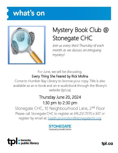 Mystery Book Club at Stonegate CHC Join us every third Thursday of each month as we discuss an intriguing mystery! For June, we will be discussing, Every Thing She Feared by Rick Mofina Come to Humber Bay Library to borrow your copy Title is aIso available as an e-book and an e-audiobook through the library's […]