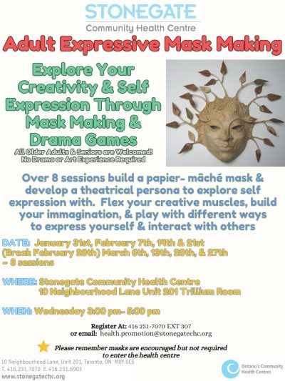 Stonegate Community Health Centre 10 Neighbourhood Lane, Unit 201, Stonegate CHC, ETOBICOKE, Ontario, CanadaAdult Expressive Mask Making Explore Your Creativity & Self Expression Through Mask Making & Drama Games Over 8 sessions build a papier- mâché mask & develop a theatrical persona to explore self-expression with. Flex your creative muscles, build your imagination, & play with different ways to express yourself & interact with others. DATE: January 31st, […]