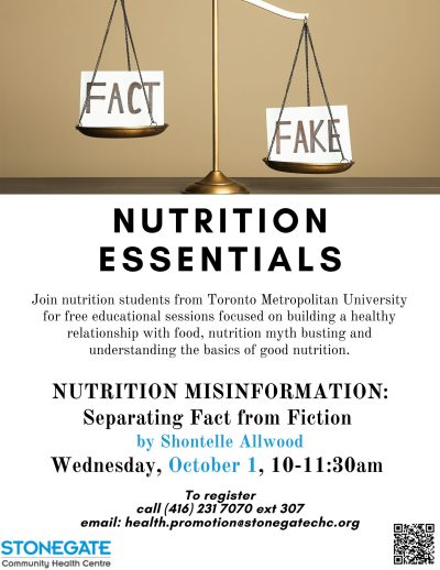 ![]() NUTRITION ESSENTIALS Join nutrition students from Toronto Metropolitan University for free educational sessions focused on building a healthy relationship with food, nutrition myth busting and understanding the basics of good nutrition. NUTRITION MISINFORMATION: Separating Fact from Fiction by Shontelle Allwood Wednesday, October 1, 10-11:30am To register call {416} 2317070 ext 307 email: health.promotion@stonegatechc.org |