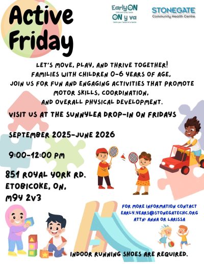 Royal York United Church 851 Royal York Rd, Etobicoke, ON, CanadaActive Friday Let’s move, play, and thrive together! Families with children 0-6 years of age, join us for fun and engaging activities that promote motor skills, coordination, and overall physical development. Visit us at The sunnylea drop-in on Fridays, from September 2025 to June 2026, at 9:00-12:00 pm Location: 851 Royal York Rd., Etobicoke, On, […]